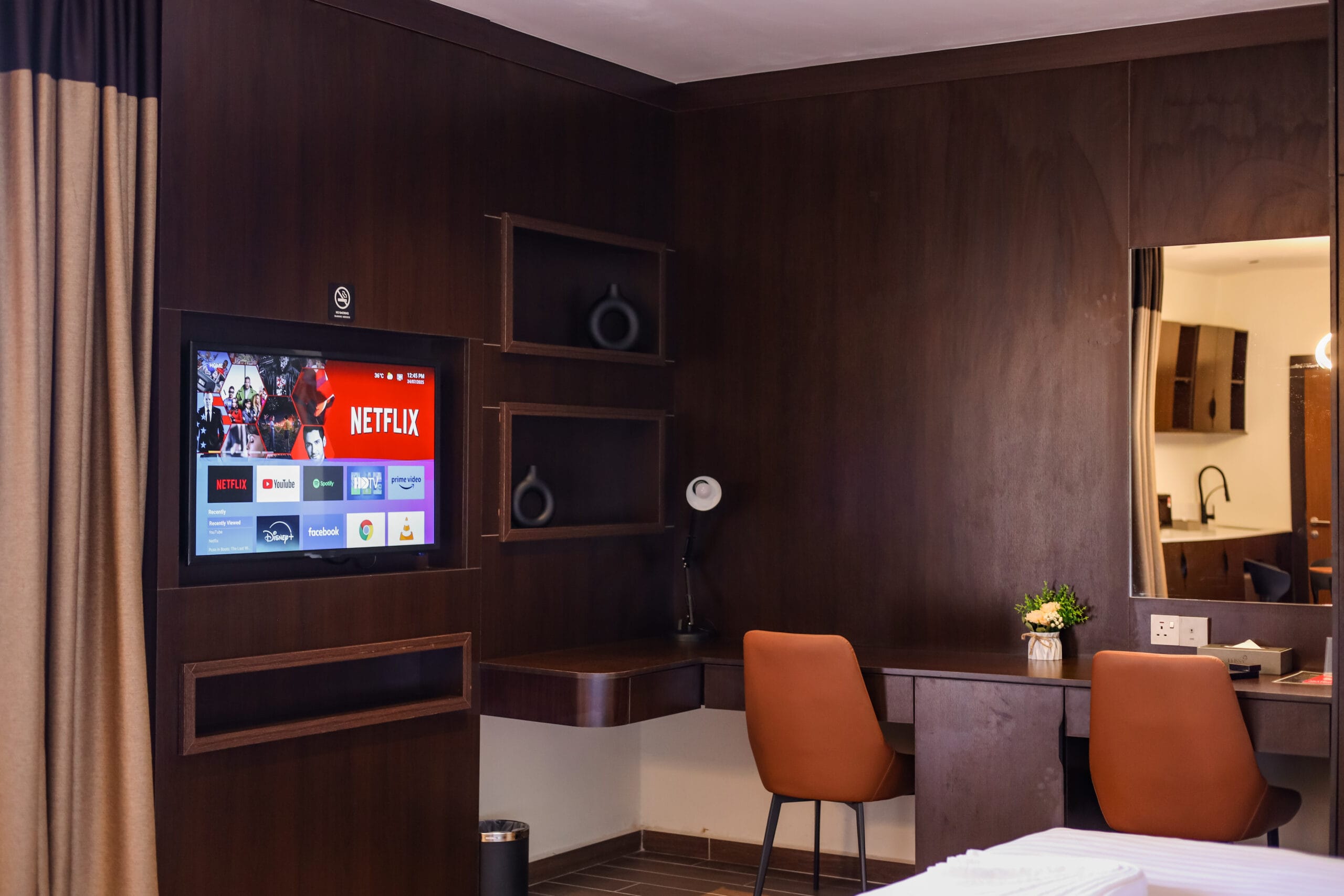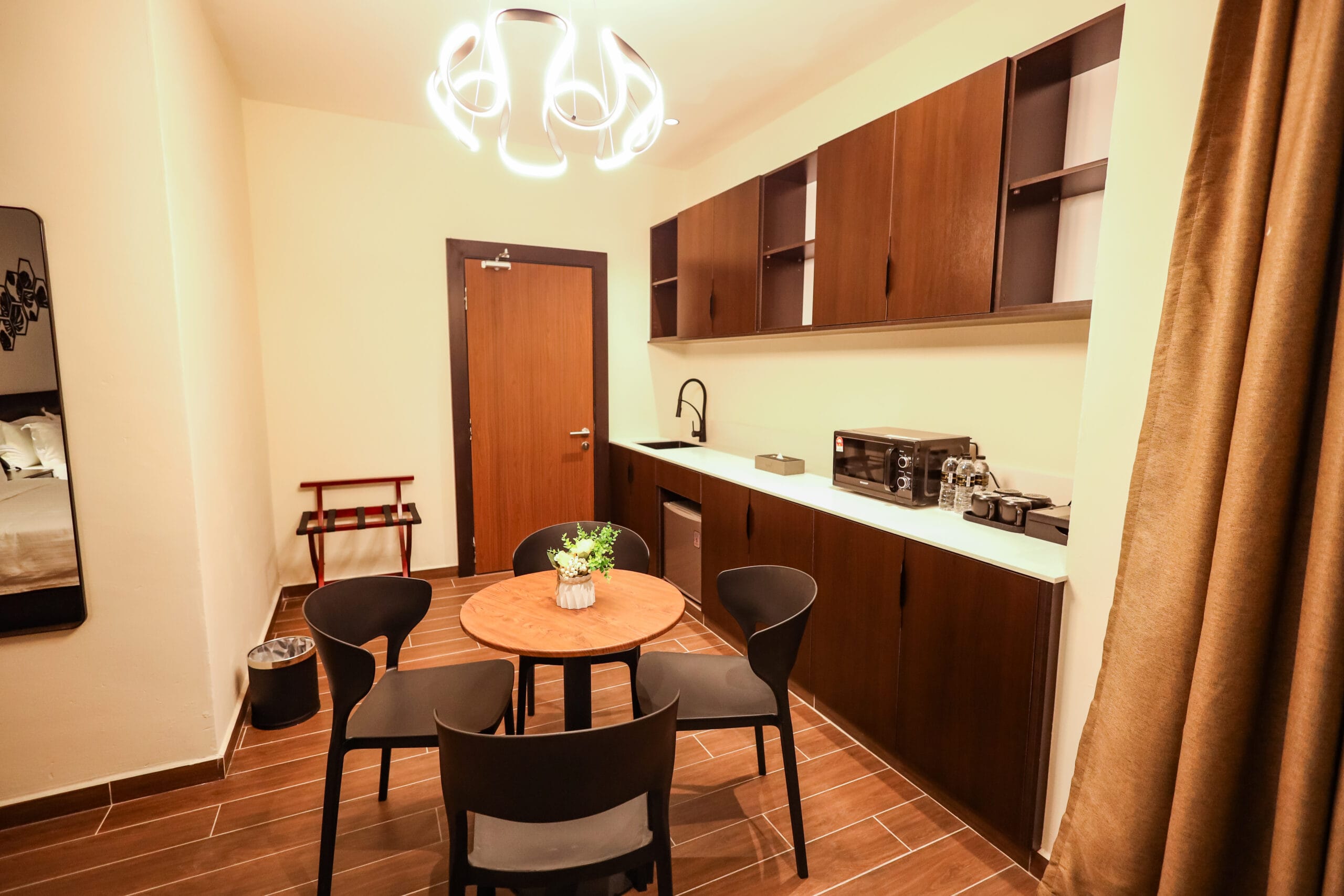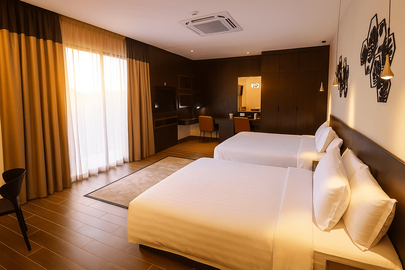 Elissa Hotel & Suites presents its Family Suites, thoughtfully designed to provide a spacious and comfortable retreat for up to 4 guests. Each suite is tastefully furnished with two double beds, a well-equipped kitchenette featuring a microwave, and a dining area, offering ample space for families to relax and enjoy their stay together. Modern amenities include air-conditioning, a smart TV, in-room telephone, ironing facilities, and a refreshment station with kettle and premium tea selections, along with essential toiletries for added convenience. Guests can also enjoy a private balcony with scenic views of Bukit Lagi or Kangar town. Combining elegance, comfort, and practicality, the Family Suites are the perfect choice for memorable family stays.